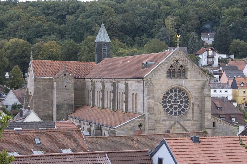 The Abbey Church of Otterberg was founded in 1143 by Cistercians as the abbey church of a daughter abbey of the Eberbach monastery. In the 15th century, the monastery slowly declined. In 1504, and in 1525 during the Peasants' War, the monastery was burned and plundered. At the end of the 16th century, the abbey church began to be used simultaneously by the Catholic and Protestant parishes, but not without causing disputes. In 1708, therefore, a separation wall was built between the two spaces. The choir hall with the transept is now used as the Catholic part, and the remaining nave as the Protestant part. In 1979, the wall was removed as part of a major renovation, but the structure of the property was not changed.
