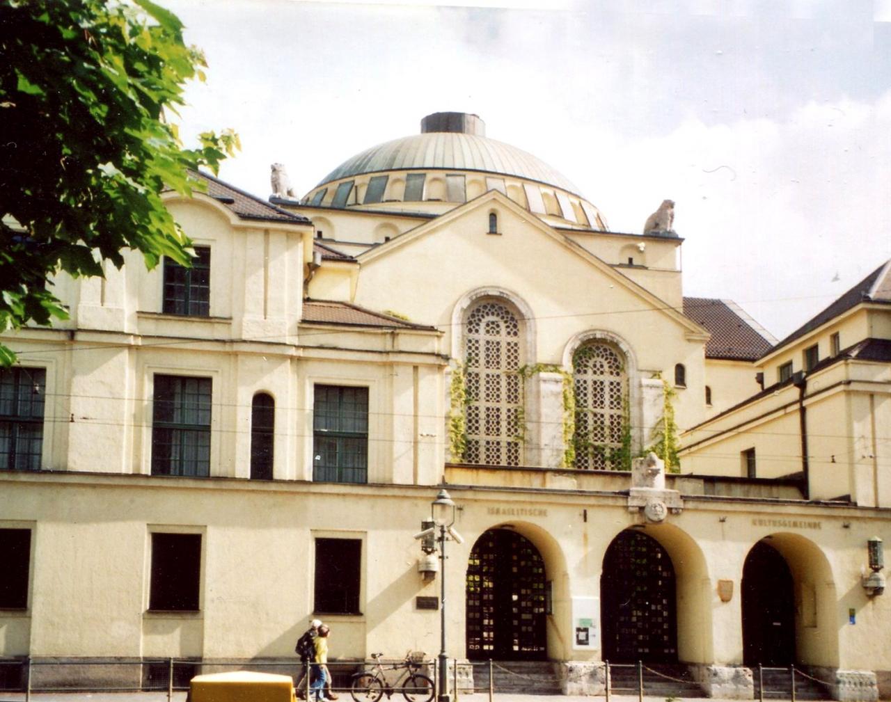 The New synagogue in Augsburg was built between 1913 and 1917 designed by the architects Fritz Landauer and Heinrich Lömpel. The synagogue is atypical in being richly decorated with iconographic decorations including a colored mosaic above the Torah ark.