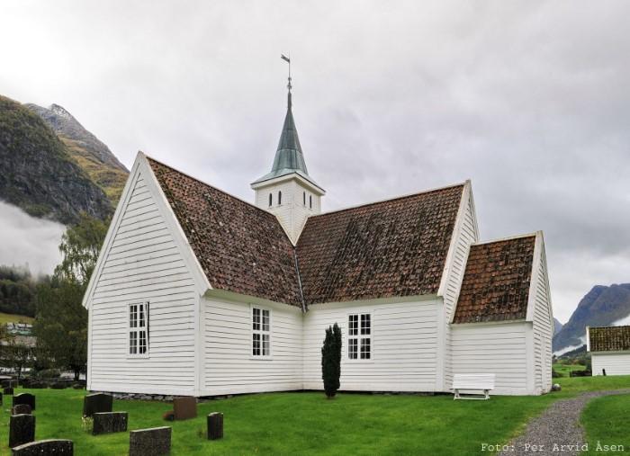 In 1746 the old Stave church in Olden was demolished and a new church was built. 11 years later, strong winds destroyed this church, which led to the construction of the present church, completed in 1759. Inside, the choir contains several portraits of priests from the 17th and 18th centuries. The late Baroque stone sculpture of the Madonna was donated to the church in the 1940s.