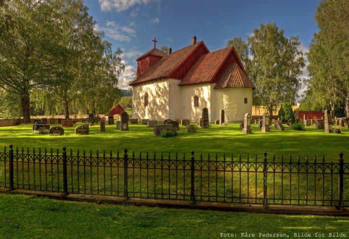 The church of Romnes, which was built between 1150 and 1250, is a Romanesque stone church with a square nave and a smaller, lower square chancel with a semicircular end, the apse. The gables are made of wood, the choir and the nave have a gable roof. In front of the west entrance, there is a square wooden tower with a pyramidal roof. The church was the private property of the Aall family until 1986.