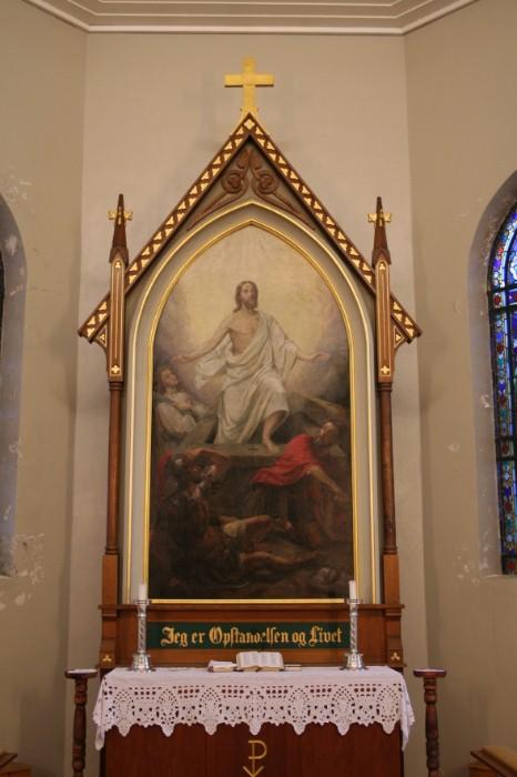 The Sandnes Church is a long church with neo-gothic forms, built in 1882 from plastered bricks according to the plans of the architect H. S. Eckhoff. In 1949 the tower was raised and equipped with four small towers around the lower part of the tower cap. The main door with the frame was rebuilt in 1953, designed by the sculptor Ståle Kyllingstad, with ornaments and figures in terracotta.