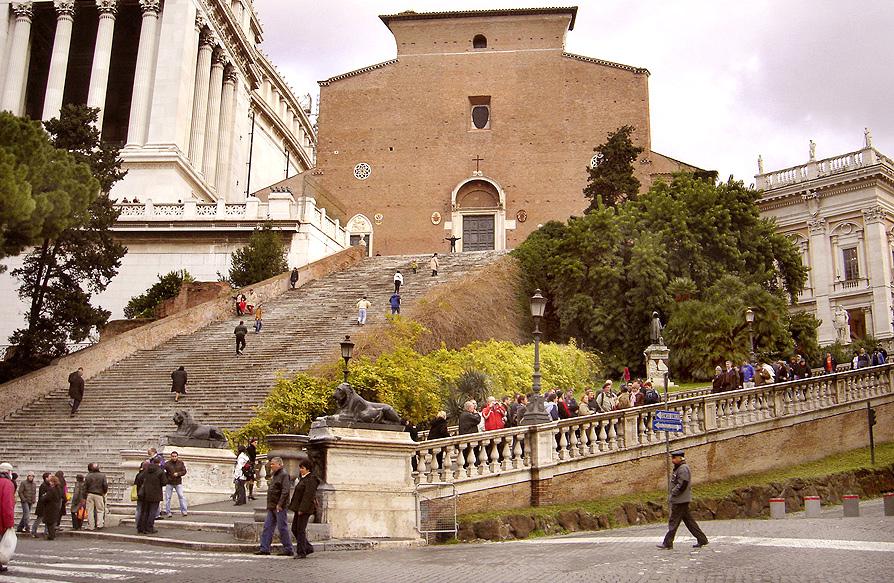 The Basilica of Santa Maria in Aracoeli stands on the hill of the Campidoglio. The church, whose original name was Santa Maria in Capitolio, was part of the complex of buildings of a monastery that had settled on the Capitoline hill while the rest of the ancient Roman buildings was in ruins.