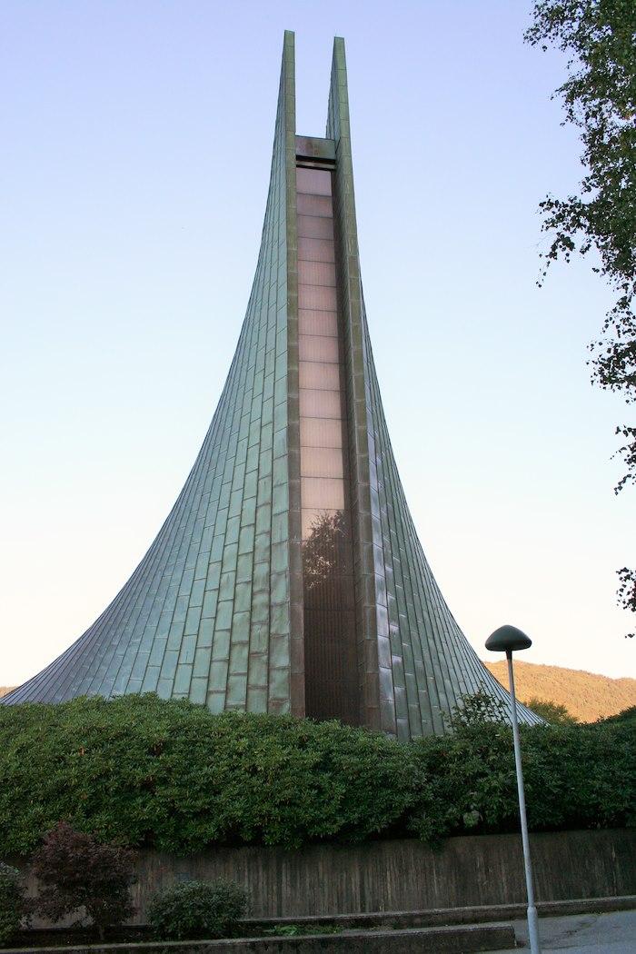 Slettebakken Church is a 1970 church designed by architect Tore Sveram. The structure is made of concrete with a copper roof whose shape, from several angles, resembles that of a boat with a high mast to the sky. The original drawings of the architect Tore Sveram for the church of Slettebakken are kept in the archives of the city of Bergen.