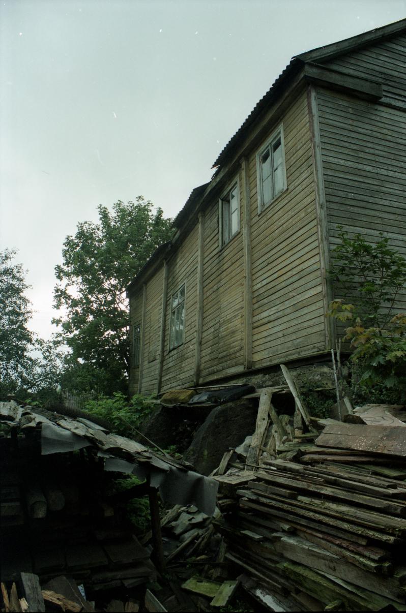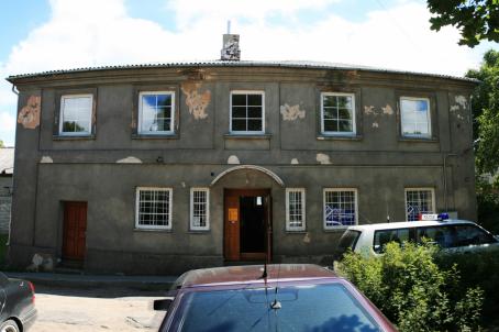 The beit midrash, built in 1928, stands north of Taikos Street, facing the town center with its southern entrance façade. It is a rectangular log structure on a fieldstone masonry foundation, covered with horizontal planks. Oriented with its short walls to east and west, it is 15.13 m long, 13.77 wide and 10.07 m high above the foundation. The building is topped with a gable roof, covered with asbestos sheets; original shingles are partially preserved under them. The prayer hall occupied the eastern part of the building, while the women's section was situated on the first floor of the western part. It may be assumed that the prayer hall was lit by the three windows on south and north; currently, there are only two rectangular windows on each side. The original fenestration on the east is unknown; a doorway in the southern part of the eastern façade is of post-WWII origins. There are no remains of Torah ark or bimah. Two small rectangular windows on the northern façade, and one similar window on each western and southern façades once gave light to the women's section. After WWII, the beit midrash was converted into a palace of culture. The prayer hall was changed into an auditorium, with the stage at the western end, over part of the original vestibule. A wooden entrance portico under a gable roof was added to the southern façade, and a plastered brick cinema projection unit to the eastern one. The building has been abandoned since the 1990s.
