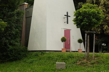 The motorway chapel Gramschatzer Wald is an ecumenical ‘road church’ located east of the Gramschatzer Wald junction of the Federal Motorway 7. The chapel was planned and built by the Regensburg architect Haymo Ruscheinsky. The prayer room was consecrated in 2015. The furniture is completely made of wood. The Regensburg painter Ralf Peinl designed the interior walls of exposed concrete with signs of death and resurrection.