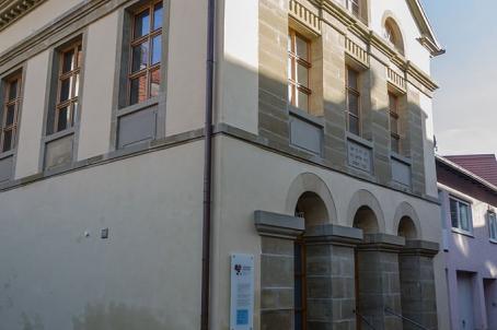The Synagogue in Arnstein is an Ashkenazi synagogue completed in 1819. The eastern wall of the prayer hall above the Torah ark was decorated with a depiction of the Jerusalem Temple. Only upper part of the mural is preserved, showing open curtains and hanging lamps. During the renovation of 1905, the vault of the prayer hall was decorated with Judenstil paintings, including a pair of griffins flanking the semi-circle window in the eastern wall. Each griffin holds a coat of arms. The synagogue was renovated in 2008-2012 and serves now as a cultural center. In use until 1938, this stone synagogue now serves as a cultural centre.