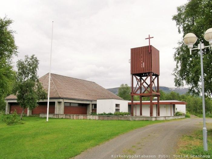 The Gratangen church is a modernist church from 1971, built by the architect Oskar Norderval. The building has a low, flat roof, but two triangular, vertical concrete slabs rise up like a sail. Between the slabs hang the church bells.