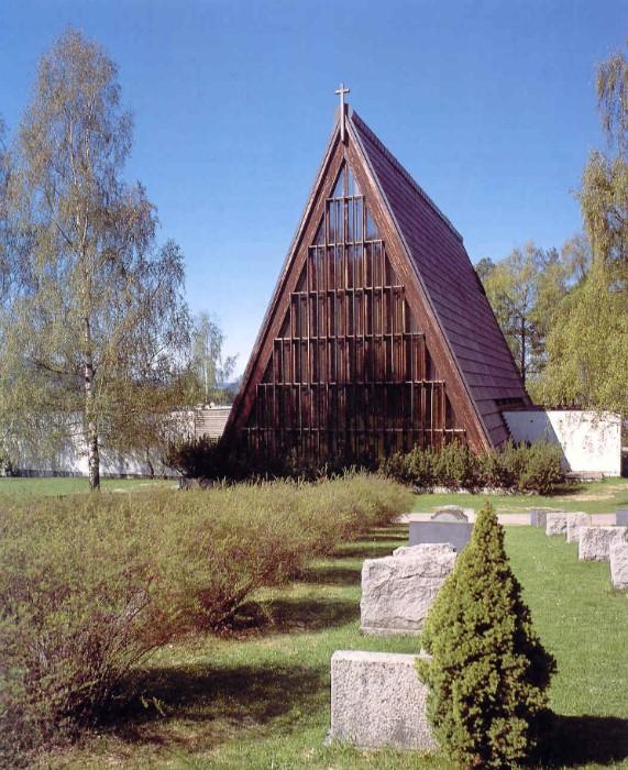 The Brumunddal church is a wooden church in the shape of a boathouse with roofs that reach down to the ground. The church was built according to the plans of architects Sven Erik Lundby, Molle and Per Cappelen in 1965.