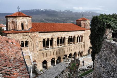 The church of St. Clement and Panteleimon is a replica of the old church of St. Panteleimon, built by St. Clement of Ohrid in 863, demolished by the Ottomans. The construction of the present church was completed in 2002. In the northern outer part, traces of the Sultan-Mehmed (Imaret) Mosque, built there during the Ottoman period, have been left.