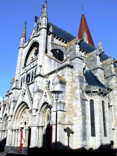 The church is oriented in the shape of a Latin cross. It ends in a polygonal chevet with five apse chapels with ambulatory and has a central vessel flanked by aisles.