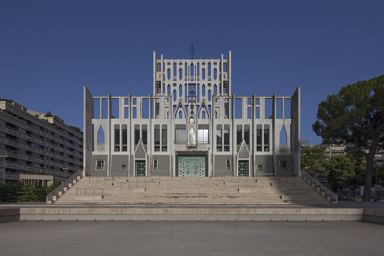 Concattedrale Gran Madre di Dio was built between 1967 and 1970 following the design of the architect Gio Ponti. The structure refers to the maritime tradition of the city, representing a "sail" that is reflected in the water of the three pools in front of the entrance, symbolizing the sea.