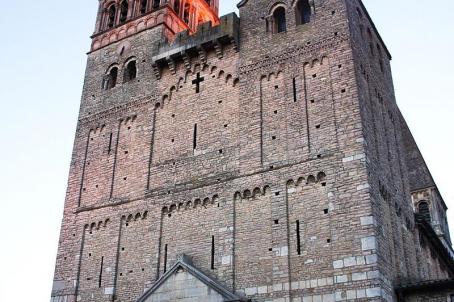 C’est à Chânes, petit village vigneron perché sur les premières hauteurs du Beaujolais, que les moines de l’Abbaye de Cluny voisine ont construit au XIe siècle, sur le site d’une ancienne église du IXe siècle, l’église Saint Pierre et Saint Paul. La nef unique, typiquement romane (XIe s.), dont on peut voir la charpente brute, est éclairée de chaque côté par deux fenêtres élargies. Sa toiture est en pierre de lave. L’abside en cul de four (XIIe s.) présente un arc triomphal en plein cintre éclairé par trois fenêtres. La façade en pignon (XIe s.) est formée par un mur droit sans contreforts. Décorée d’arcatures lombardes en plein cintre soulignées d’une bande horizontale dite « en dents de scie » ou « dents de loup », elle est caractéristique des ornementations des églises du premier art roman en Mâconnais. La tour-clocher octogonale à trois étages, de type clunisien (XIIe s.) comporte quatre pans (de taille inégale à l’est et à l’ouest ) et vingt-huit colonnettes. Construite au XIIe siècle, elle est terminée (les deux étages et la flèche) au milieu du XIXe siècle. La chapelle de la Sainte Vierge date du milieu du XVIIème siècle. Comme beaucoup d’autres monuments religieux, l’église est pillée à la révolution. Au XIXe siècle, on ajoute à l’église la chapelle Sud et la sacristie tandis que, dans la partie cintrée de l’abside, sur la coupole en forme de calotte byzantine E. Krug peint une fresque (1873) de style byzantin. Cette dernière représente le Christ confiant sa mission à Saint Pierre et à Saint Paul, patrons de la paroisse. Outre une architecture remarquable, l’église abrite des trésors : le maître-autel dont l’antependium est orné et une vierge vigneronne en bois (XVIIIe s.), spécifiquement bourguignonne