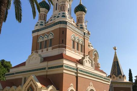La cathédrale, destinée à répondre aux besoins de la colonie russe, a été construite à partir de 1903 par Préobrajenski, professeur d'architecture à l'Académie impériale des Beaux-Arts de Saint-Petersbourg, qui s'inspire des églises à cinq coupoles de la fin du 16e siècle de la région de Moscou.