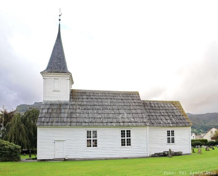 The Gjerde church was moved to Etne in 1676. It was previously located at Sandviken in Bergen. In 1930 the porch was replaced by a tower with an entrance to the church through the base of the tower. In 1956 the church underwent a major restoration during which the wall paintings were uncovered and painted.