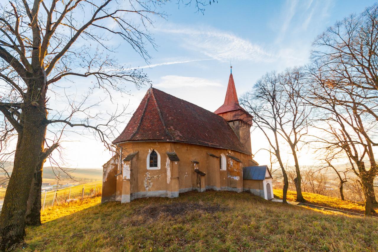 Inside the small village a hall church was erected in the 15th century, its chancel being closed by a polygonal construction. A tower with defence level and spire was built on the western side of the today standing Gothic church. As suggested by the buttresses, the interior of the church was most probably covered with vaults, which were later on replaced by a flat ceiling. Only ruins are preserved from the defence wall. Inside the church the valuable works of two well known masters from Sighişoara can be admired: an altar built in 1789 by Johannes Folberth, and above it an organ with late Baroque prospectus that Samuel Binder built in 1850