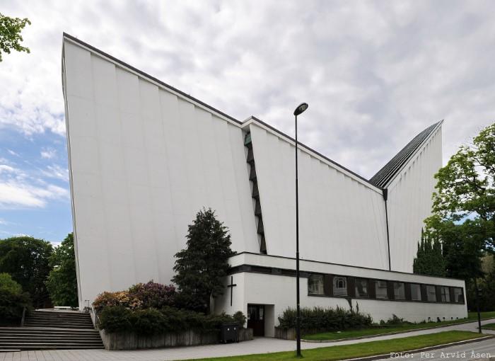 Kirkelandet Church, which was inaugurated in 1964, is a very special modernist church, erected in reinforced concrete according to drawings by Odd Østbye. The decoration of the glass walls is by Gunnar S. Gundersen, as is the cross made in 1964.
