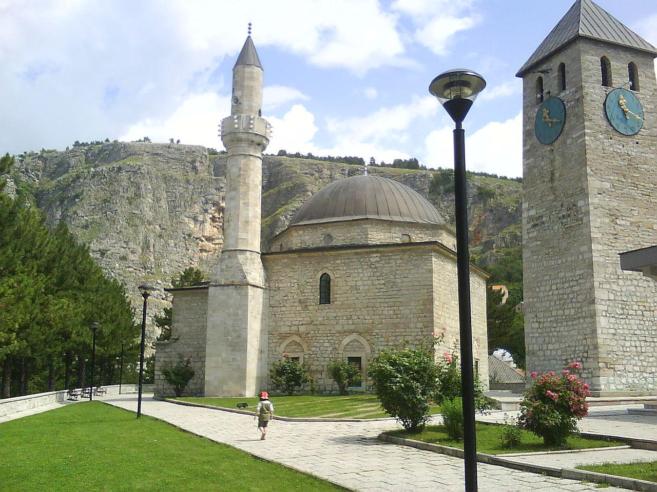 The mosque of Hajji Ahmed the Ducat Minter is one of the most recognisable symbols of the city of Livno. It was probably built between 1562 and 1574 on a natural promontory whose three sides slope steeply down to the river Bistrica. The cemetery was probably destroyed in 1878 during the Ottoman resistance against Austro-Hungarian forces. The mosque was rebuilt in 1938 and the harem was cleaned and fortified with a solid concrete wall. In 1941 the Italian army used the mosque as an ammunition depot.