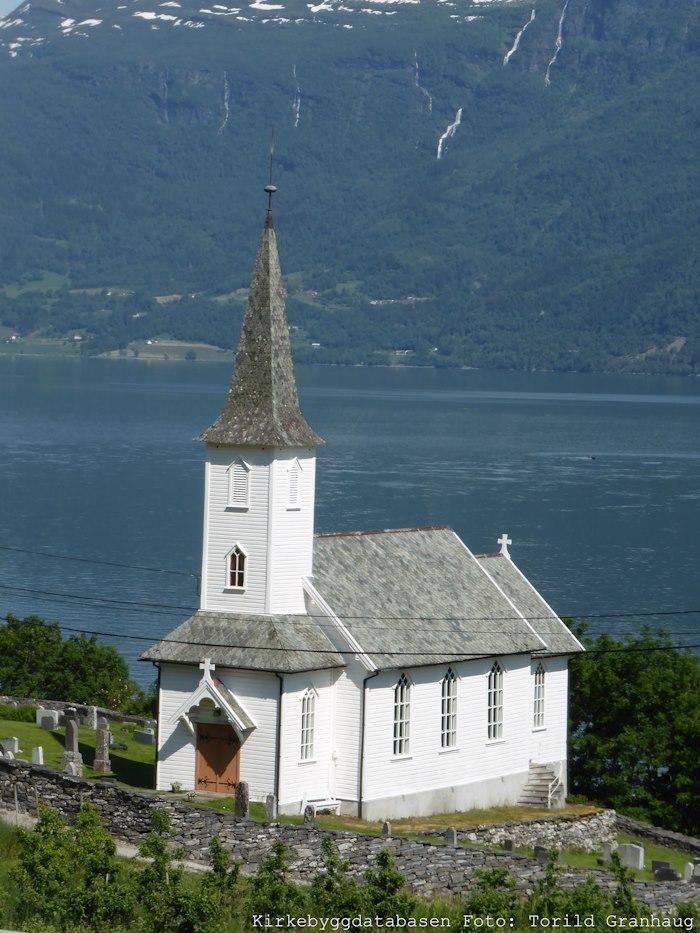 The old church of Gaupne is a wooden church dating from the mid 17th century. The church has a rectangular nave and a narrower, almost square choir. The bell tower stands at the western end of the lower part. The church has richly carved side beams on the west portal, which come from the previous church on the site. In 1909, the Society for the Preservation of Ancient Norwegian Monuments took over the church. The church hall has largely retained its 17th-century character.