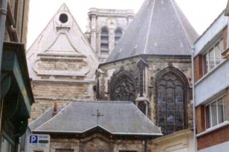 The cathedral of Lille integrates an exuberant and grandiose neo-gothic architecture, never finished, with an Art Nouveau decor in the chapels, and finally a contemporary facade that is unique in style and materials. A technical and attractive feat, using a metal-framework for a pointed arch enclosing 110 plates of thin translucent marble, white on the outside and giving a flamboyant orange light within the church.