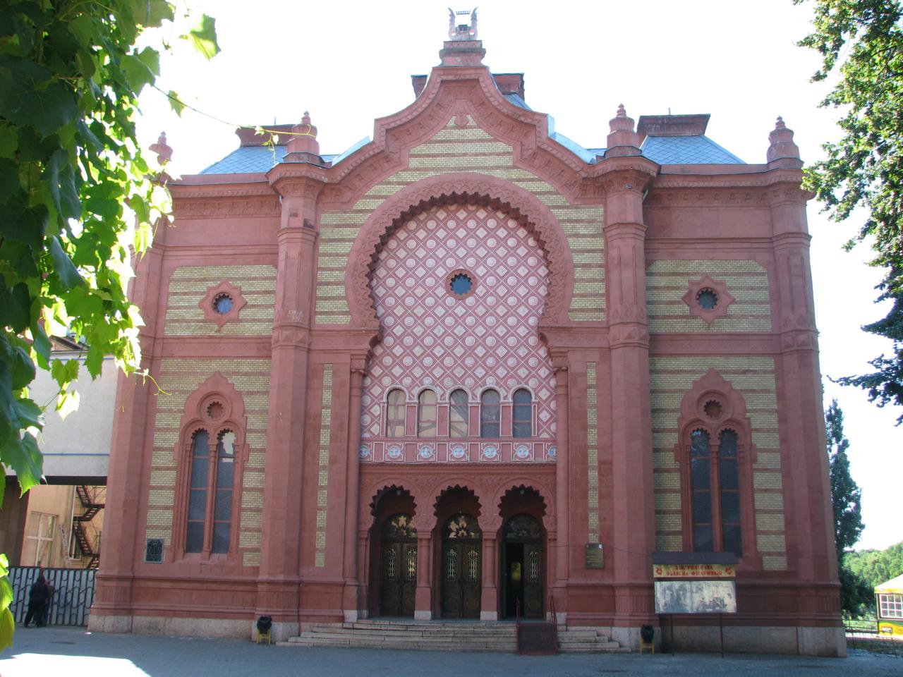 The Orthodox Synagogue in Uzhhorod was completed in 1904 by architects Dula Papp and Ferenc Szabolcsi (Grósz). This Hungarian Secessionist brick building is now a theater.