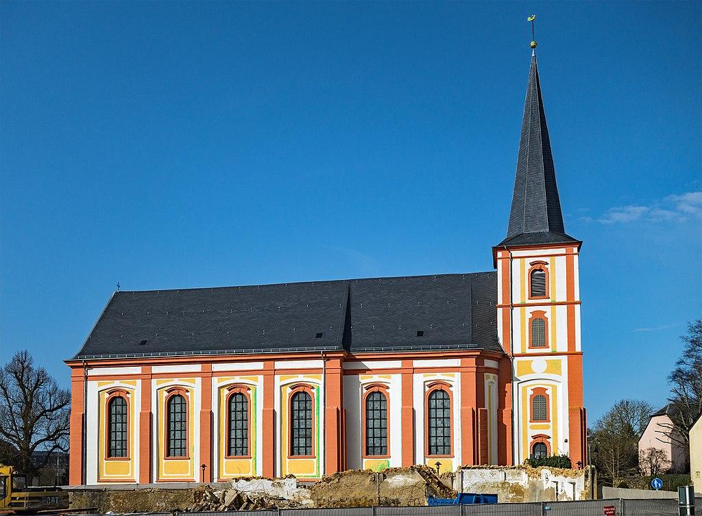 The church was built from 1844-1850 in the classicist style according to the plans of the provincial architect Theodor Eberhard from Luxembourg. The monumental porch gives the impression of old temples; 4 fluted, Doric columns support a triangular gable with the symbolic "Eye of God".