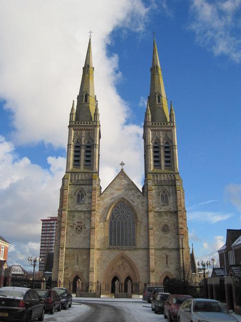 St Peter's Cathedral, built in the 1860s, is Belfast's Catholic cathedral. During the 19th century, thousands of Catholic workers came to Belfast in search of employment in the growing industries, particularly in the flax industry. The centre of Catholic life in Belfast at that time was St Mary's Church in Chapel Lane, near the old city centre. In 1858, in order to enable the growing number of worshippers to attend services, Barney Hughes, a leading Catholic lay preacher and wealthy bakery chain operator, bought land between Dystart Street, Derby Street and Alexander Street and gave it to Bishop Denvier. Construction of the cathedral began in 1861.