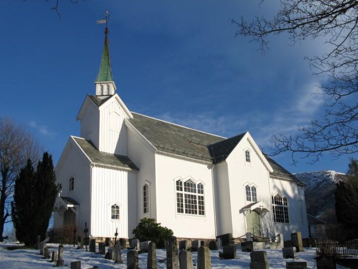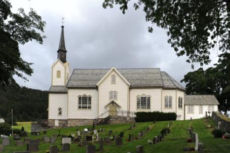 Skodje church dates from 1860 and is built of wood. The architect was F. Meinhardt and the builders were Gjert Lien and Elias Tonning from Nordfjord. The altarpiece on the altar in the church dates from 1883 and is a copy by Adolph Tidemand.