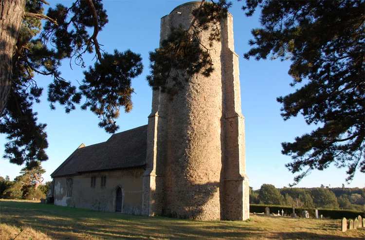 All Saints church is located in Ramsholt, a deserted village in Suffolk on the northern shores of the River Deben estuary. Today, only the church, a pub on the river and a farmouse remain. It is probably the most beautifully located of all Round Tower Churches.
