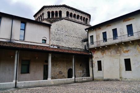 The Basilica of San Salvatore was founded in 753 as the church of the female monastery of San Salvatore and was completed more than eight centuries later, in 1599. Of the original church, only the structure with three naves marked by columns and capitals is preserved. The church is entirely decorated with some of the richest and best-preserved stuccoes and frescoes of the early Middle Ages. The complex is one of the seven UNESCO World Heritage Sites that bear witness to the culture of the Lombard people.