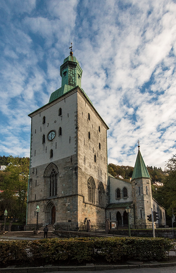 Bergen Cathedral is a long stone church from the second half of the 13th century. The church was built for the Franciscans and is the only one of the mendicant monks' churches in Norway that is still preserved. The church was extensively restored after the city fire of 1702, and in the late 19th century it was extensively modified under the direction of the architect Peter Blix. Many medieval stone details were renewed and the rococo interiors were removed. Today, the church has a two-aisled church hall and an east choir. In the 17th century, the church was given a tower to the west and a nave to the south. The interior was completely neo-Gothic from the 1880s.