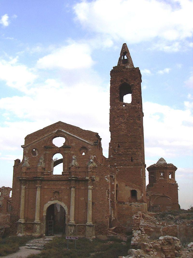 The church of San Martin de Tours in Belchite Viejo (province of Zaragoza, Spain) was built in the first decades of the 15th century, although it was later renovated in 1550. The new opening, included the exterior decoration of the apse. Also, in the 18th century, the nave was enlarged, and another section at its foot, altered chapels a some of the sides were made into a memorial table.