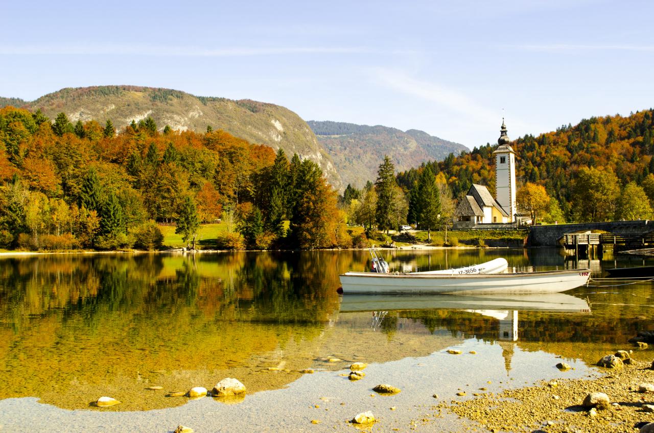 The Church of St. John the Baptist stands has been standing on the south-eastern shore of Lake Bohinj since at least 1300. The church contains frescoes by Jernej of Loka, a 16th-century painter active in the Škofja Loka region. The bell tower has an old mechanical clock.