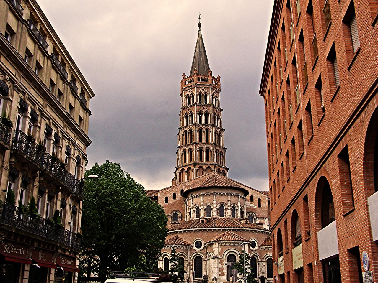 L’édifice se trouve dans la ville, place Saint-Sernin. PLAN - L’édifice, orienté, est bâti selon un plan en croix latine. Il se compose d’un narthex à trois vaisseaux, suivi d’une nef à douze travées et cinq vaisseaux, laissant place à un transept à trois travées sud-nord et onze est-ouest. Le choeur et l’abside sont entourés d’un déambulatoire à absidioles. ELÉVATION EXTÉRIEURE - La façade occidentale consiste en un massif à sommet triangulaire, composé d’un avant-corps central complété au nord et au sud par les parties du massif principal, renforcées de deux hauts contreforts à glacis de chaque côté et percées de deux baies en plein cintre à chaque premier niveau. L’avant-corps central est à trois niveaux. Le premier est percé de deux portails en plein cintre à ressauts (colonnettes, chapiteaux sculptés et voussures), suivis d’une frise de modillons soulignant une frise d’arcatures en plein cintre, le tout laissant place à un vaste oculus couronné d’un mur-pignon. Les murs gouttereaux de la nef, aussi bien pour le haut vaisseau que les bas-côtés, sont couverts d’un toit à pans et ajourés de baies en plein cintre, le tout rythmé de contreforts. Les transepts, monumentaux, sont ornés de contreforts et de baies en plein cintre. Les transepts accueillent chacun deux portails en plein cintre à chapiteaux sculptés, ainsi qu’une frise de modillons; et sont flanqués à l’est d’absidioles. La croisée du transept est couronnée d’un clocher à cinq niveaux, ajourés de multiples baies à colonnettes et chapiteaux, et couronné d’une flèche polygonale. ELÉVATION INTÉRIEURE - L’élévation de la nef est à deux niveaux pour le vaisseau central : grandes arcades en plein cintre, surmontées de fenêtres hautes géminées à colonnettes, le tout couvert d’une voûte en berceau en plein cintre, les arcs doubleaux retombant sur des colonnes relayées jusqu’au sol. Le transept suit une élévation similaire, avec des bas-côtés couverts de voûtes d’arêtes. Le choeur est couvert d’une abside en cul-de-four.