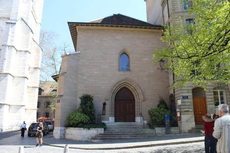 The Calvin Auditory is a Protestant chapel, originally a Catholic place of worship under the name Chapelle Notre-Dame-la-Neuve, which was built in the 15th century as a Marian church on the site of shrines dating from the 5th century and originally dedicated to Notre-Dame. In 1536, with the advent of the Reformation in Geneva, Calvin desacralised it and transformed it into an auditorium, where he preached his Reformed theology. The auditorium was also used by the Scottish reformer John Knox during his stay in Geneva in the 1550s.