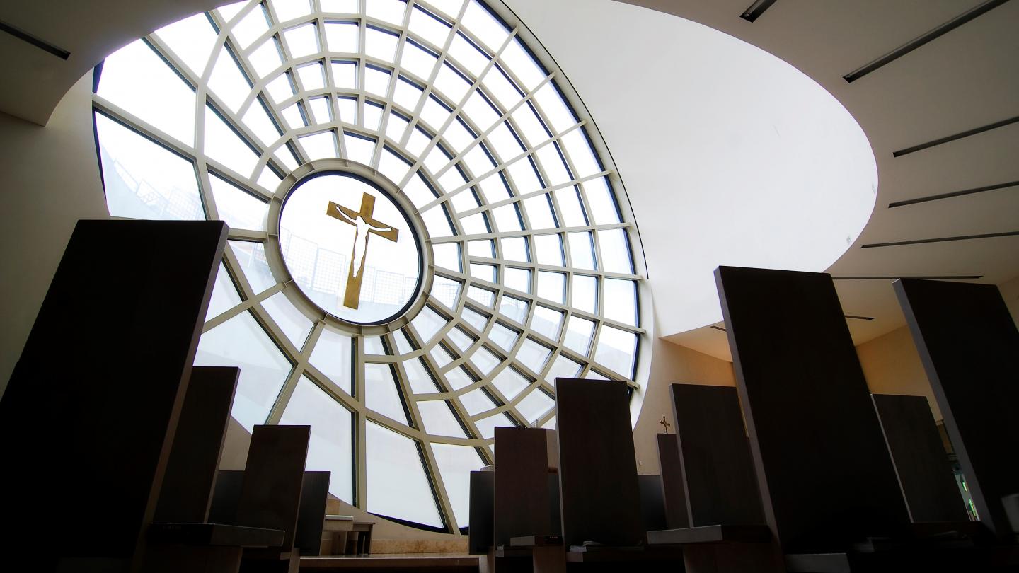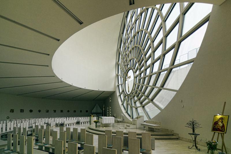 The Santo Volto di Gesù Church, built between 2003 and 2006, is one of the most successful examples of modern religious architecture in Rome. The building is based on a project of architects Piero Sartogo and Nathalie Grenon. The building plays on its luminosity as showcased by the centrality and size of its circular window, designed by Carla Accardi.