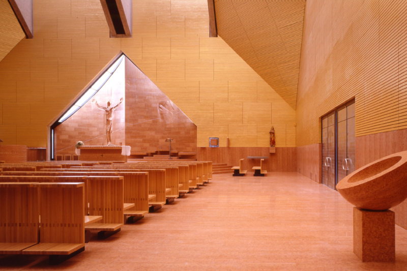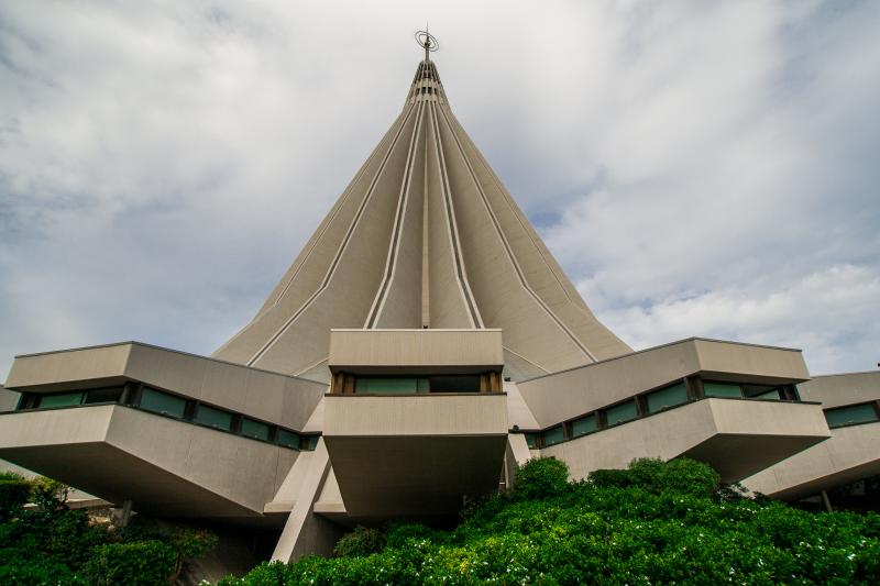 The Sacra Famiglia church, built in 1971-1974, is the first religious building made entirely from reinforced concrete. The architect, Paolo Portoghesi, wanted to create a building that would express Christians concepts such as the unity and centrality of the divine through the use of curved shapes. The colours of the windows symbolise the dialogue between human nature and divine nature. The tubular structures can be assimilated to lit flames that guide visitors upwards, where the circular openings invite direct contact with God.