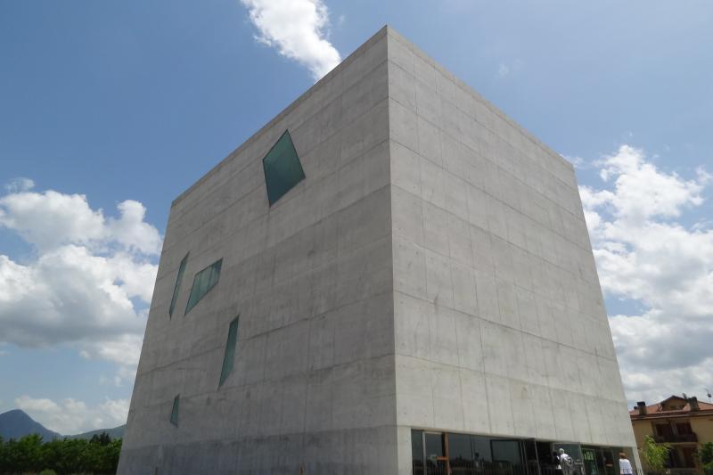San Paolo Apostolo is a modern church built between 2001 and 2009, on the location of an old church destroyed by the 1997 earthquake in the area. Designed by Massimiliano and Doriana Fuksas, it owes its cubic form to a description of the New Jerusalem in the book of Revelation, suggesting that the holy city has an equal length and breadth.