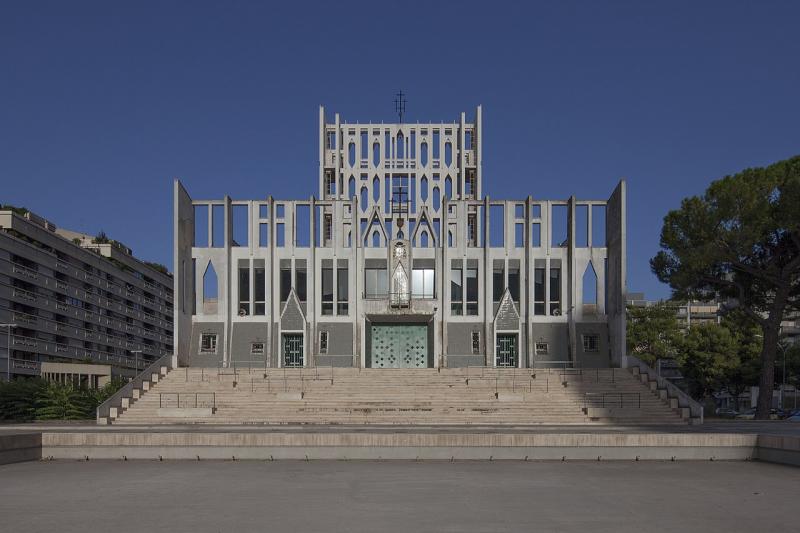 Concattedrale Gran Madre di Dio was built between 1967 and 1970 following the design of architect Gio Ponti. The structure refers to the maritime tradition of the city, representing a "sail" that is reflected in the water of the three pools in front of the entrance, symbolising the sea. The interior, with its vaulted ceiling with plaster walls and stone high altar, is decorated by an apse with the themes of the Annunciation.