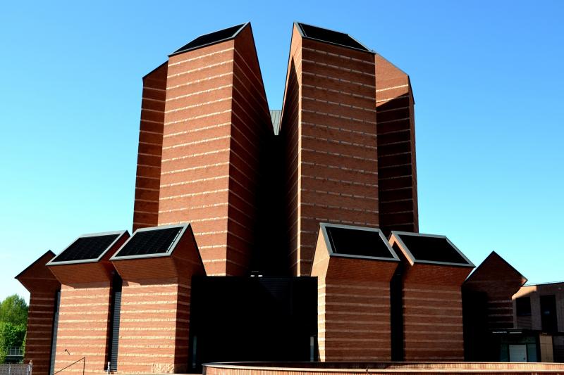 Santo Volto was built between 2004 and 2006 based on a design by Mario Botta. The brick building draws its inspiration from the industrial district in which it is located; an ancient chimney was intentionally left beside the church. The building is surrounded by seven radially arranged towers that are closed at the top by skylights.