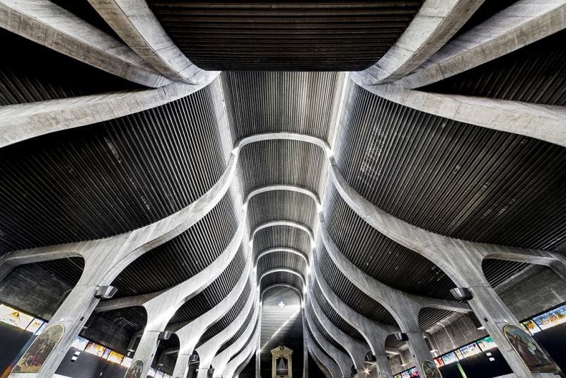 San Nicolao della Flue, built in 1968-1969, was designed by architect Ignazio Gardella of the ‘Modern Movement’. A fundamental element of Gardella's project is the sailcloth, which characterises both the interior and exterior. In the shape of an upturned ship hull of reinforced concrete, the interior displays an impressive and futurist succession of anthracite arches.