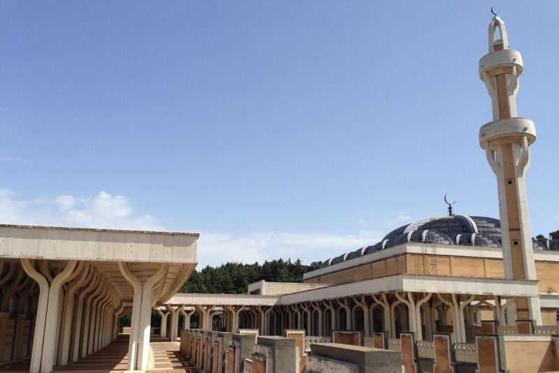 The Great Mosque of Rome, built between 1984 and 1995, is the largest mosque in Italy and the largest in Europe. The work of the architect Paolo Portoghesi is meant as a modern syncretism of Maghreb, Ottoman and Persian mosque architecture. The whole is designed to be integrated into the green environment.