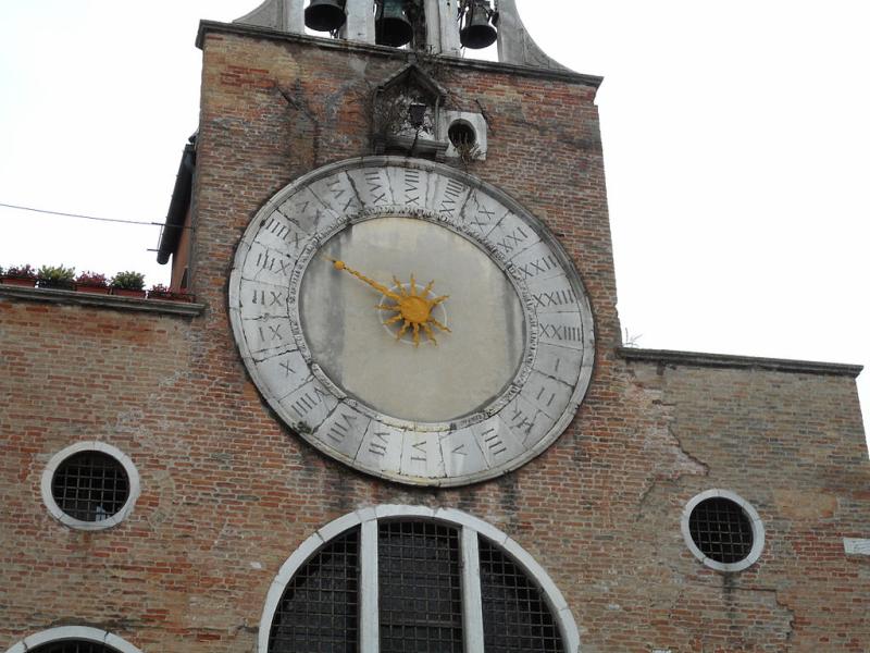 The church of San Giacomo di Rialto is said to be the oldest church in Venice, founded in 421. The prominent 15th-century clock on its tower was an important element for the functioning of the Rialto market that took place in the vicinity of the church. A curious characteristic of this clock is that it completes its turn at 24 o'clock rather than 12 o'clock like most clocks. Furthermore, the 12 o'clock midday and midnight are not at the top or bottom of the clock circle, but right and left.