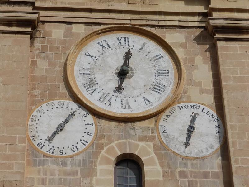 The tower of the Co-Cathedral of St John in Valletta doesn’t have one, but three clocks. The larger one shows the time, while the two smaller clocks below it indicate the day of the week and month. The name of the clockmaker can still be read in a Latin inscription below the large top clock: "Clerici invenit". The clocks, which were painted directly on the sandstone wall of the tower, were repainted during the restoration of the Cathedral's façade between 2014 and 2017.
