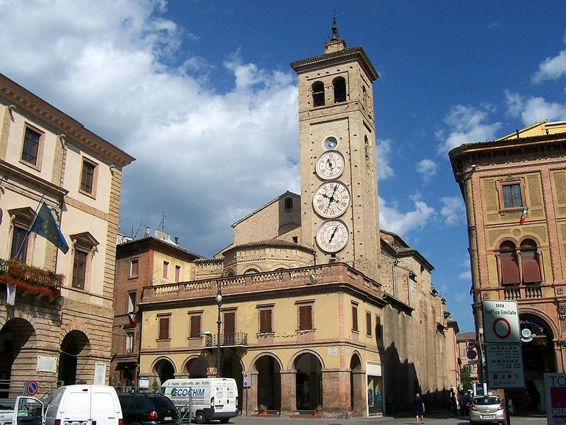 Another rare example of church tower with multiple clocks can be found in Tolentino, Italy. At the back of the Church of Saint Francis stands the so-called "Torre degli Orologi" (Clock Tower), an icon of Tolentino. The tower has four clocks: the top one shows the phases of the moon, the second shows the different sections of each hour, the third shows the hours of the day, and the fourth shows the days of the week and month.