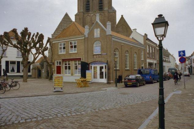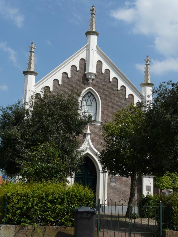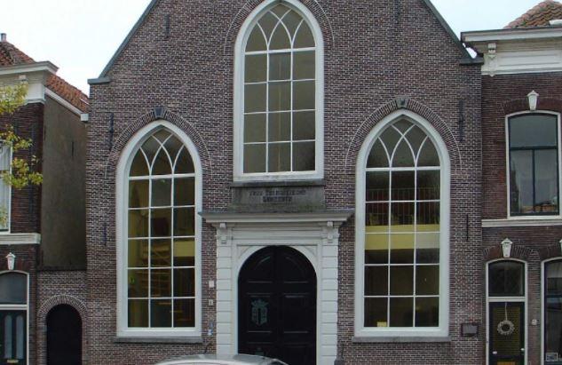 A former Baptist church was bought by the Jewish community of Gouda in the year 1798. The building was reused as a synagogue but had to be demolished in 1823 because of structural deterioration. A new synagogue was built on the same site and was consecrated in 1827. The front façade features eclectic architectural elements. This façade is provided with Neo-Gothic pointed arched windows and a Neo-Classical ornamented entrance. After the Second World War, the Jewish community of Gouda was too small to sustain their own synagogue. The building was sold in 1950 and only the women's gallery remained in the interior of the building. The design of both the original women's gallery and the Torah ark was probably influenced by the designs of the furniture in the synagogue in Leiden. The pointed arched windows, located near the former Torah ark, were walled up to suit the new church organ. In use until WWII, this brick synagogue has been sold after the war and now serves as a church.