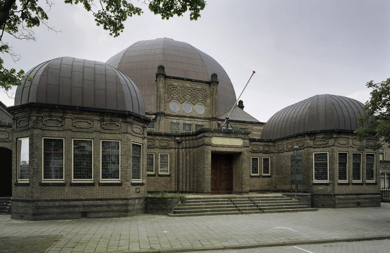 The synagogue was designed by the architect J. A. Mulock Houwer in a distinct Oriental architectural style. The function of the building can be identified as such by the Stone Tablets, located at the very top of the façade. The Moorish architectural features include the octagonal pinnacles and onion-shaped domes which evoke the architectural style of minarets. The close relationship with minarets was strengthened by the fact that the these pinnacles were originally topped with moon sickles while the central pinnacle was adorned with the Star of David. Another typical feature includes the horseshoe-shaped window arches, supported by small columns. The interior of the synagogue was destroyed and looted during the Second World War. The synagogue used to contain stained glass windows depicting the Twelve Tribes of Israel but these are no longer present. The Jewish services resumed between 1947 and 1952 after which the community held their services in the synagogue located along the Lange Bisschopstraat. The original synagogue was repurposed as a reformed church. The Torah niche has since been used as the location for the pulpit and organ. In the beginning of 2018, the Christian reformed community sold the building to Ayhan Sahin who wanted to redevelop the former synagogue into a food hall. This caused the Jewish community of Beth Shoshanna to start their own crowdfunding campaign with the idea of repurposing it as a cultural community center in order to respect the former religious function of the building.
