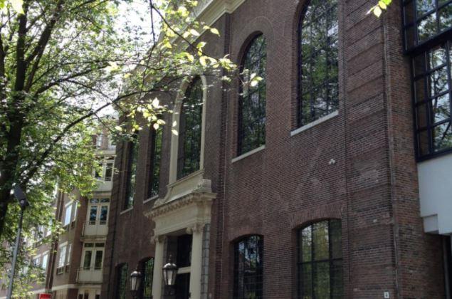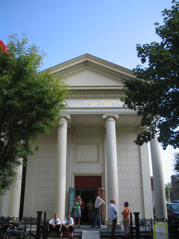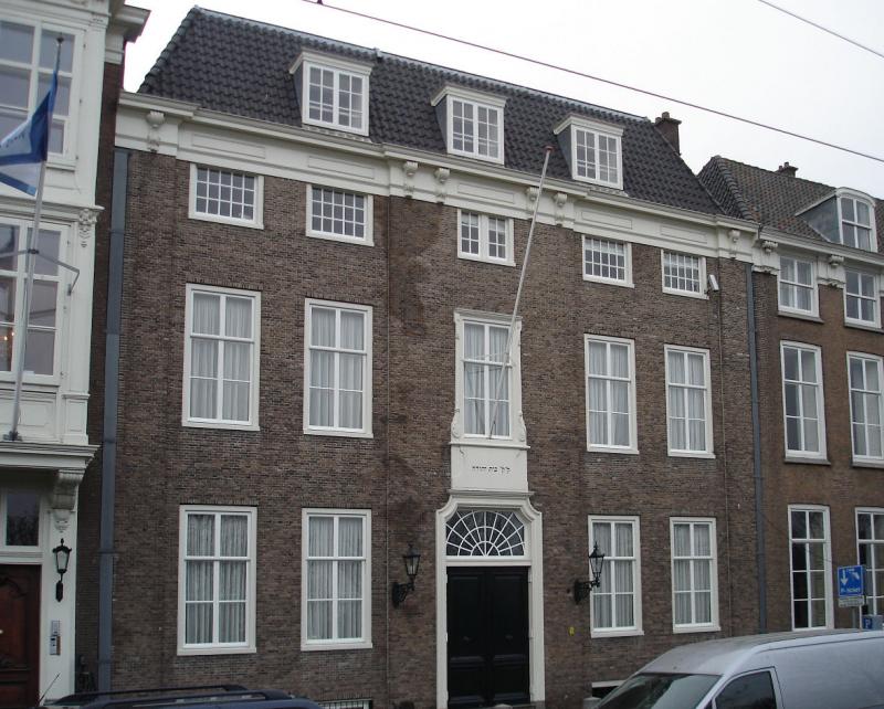 This synagogue is considered to be the first synagogue in the Netherlands which was recognizable as such by its exterior. It was constructed in 1670/71 and its design is attributed to the architect Elias Bouman. The plan of the building is almost square-shaped. The wooden vaulted roof and the women's gallery were supported by four large columns. The bimah was located at the center of the interior which faced the monumental Torah ark. The small rectangular building at the corner of the street originally a mikveh. A neoclassical entrance with its triangular pediments was later added to this building around the year 1822/23. During the Second World War, the synagogue was closed down in 1943 and was subsequently looted. The municipality of Amsterdam bought the complex, including the New Synagogue, Obbene Shul, and Dritt Shul in 1954. After several renovations of the synagogue complex (1966, 1976/87), the buildings were redeveloped as the Joods Historisch Museum (Jewish Historical Museum).