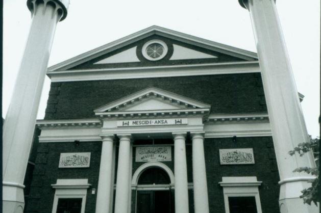 The synagogue is located behind the private residences of the Wagenstraat. It was consecrated in the year 1844. It replaced an older synagogue which was situated at the Voldersgracht (dated ca. 1721/23). The Neo-Classical main façade includes a cornice and triangular pediment with a tondo window. The entrance itself is also adorned with a triangular pediment is supported by Tuscan columns. Rounded arched windows can be found in the side walls of the building. The entrance originally contained an unknown Hebrew inscription and the date 5604 (1844 CE) but these were removed in the year 1981. The synagogue was oriented along the short axis which meant that the Torah ark was situated against the long southeastern wall. The bimah was placed at the center of the assembly hall, facing the Torah ark. The building, including the galleries which are supported by slender Ionic columns, were expanded in 1922. The complex was expanded with the establishment of an administrative building and a second synagogue along the Nieuwe Molstraat (demolished in 1981), designed by the architect H. Elte Phzn in the architectural style of the Amsterdam School. The interior of the synagogue was damaged by fire during the Second World War in 1944. Three years later, the building was again consecrated as a synagogue after which the Jewish religious services resumed. In 1976, the building became abandoned and was subsequently sold to the municipality of The Hague. The decorated Torah ark (ca. 1723) was removed and relocated to Israel in the same year. The building was repurposed as a mosque which opened its doors in the year 1979. The front façade of the building received Arabic inscriptions and two large steel minarets were placed in the forecourt of the building.