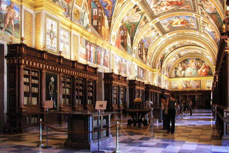 The Royal Monastery of San Lorenzo de El Escorial is a complex that includes a royal palace and basilica, a pantheon, a library, a school and a monastery. The complex was designed between 1563 and 1584 by King Philip II and his architects. The austere 33,327 m2 Renaissance building has been a UNESCO World Heritage Site since 1984. The library, with a collection of more than 45,000 volumes, is located in a large nave 54 metres long, 9 metres wide and 10 metres high. It was desired by Philip II, a literary prince trained by the greatest minds of Spain of his time, who read Latin perfectly, knew Italian and French.