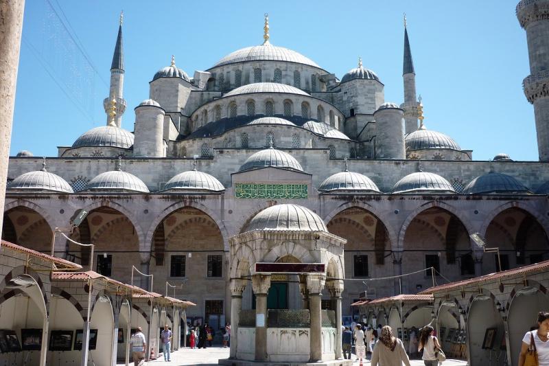 The Sultan Ahmed Mosque (also known as the Blue Mosque) is a historic mosque located in Istanbul, Turkey. It was constructed between 1609 and 1616 during the rule of Ahmed I. Its Külliye contains Ahmed's tomb, a madrasah and a hospice. Hand-painted blue tiles adorn the mosque’s interior walls, and at night the mosque is bathed in blue as lights frame the mosque’s five main domes, six minarets and eight secondary domes.